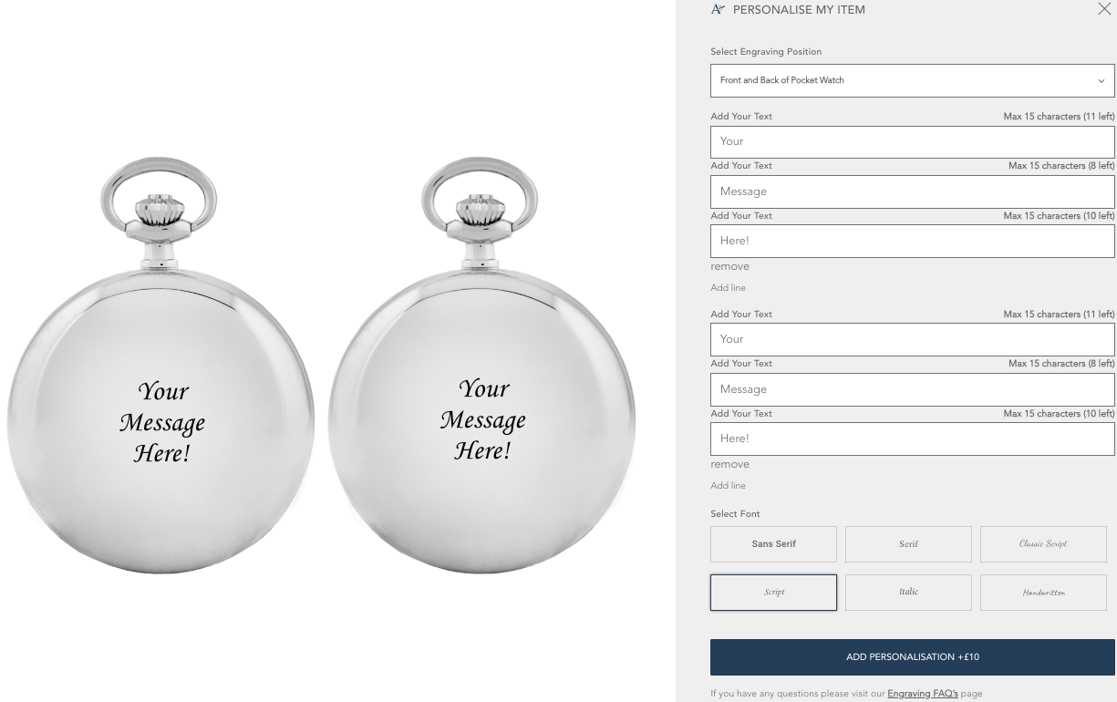 Farrar & Tanner uses in-house laser engraving for a flawless, lasting finish. Select position, enter your message, choose a font and add personalization. Offensive content may be declined, with options to modify or receive a refund. If unsatisfied, their no-quibble returns service ensures peace of mind.